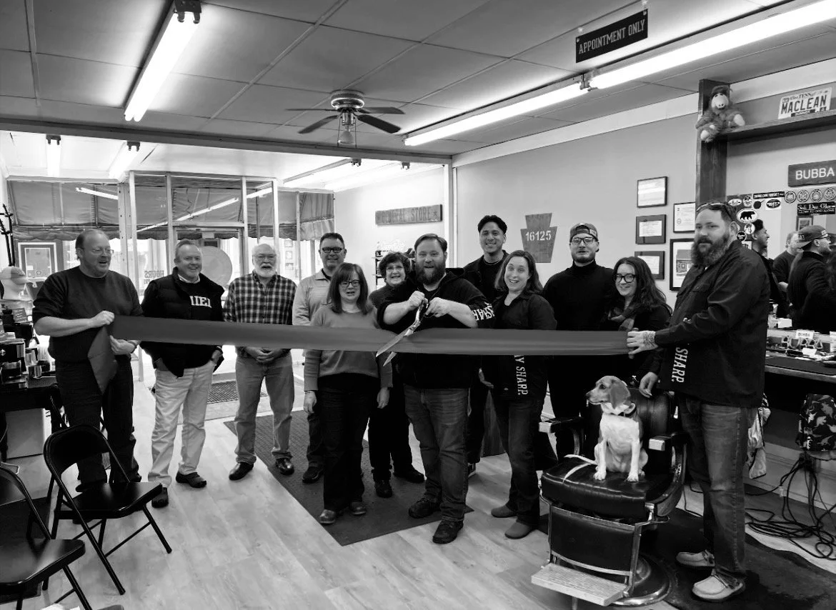 Bubba cutting the ribbon at the 10 year celebration and ribbon cutting for the new location at 219 Main Street in February 2025. Pictured L-R is Greenville Mayor Paul Hamill, Mercer County Commissioner Tim McGonigle, Bubba’s father, Ron Beil, Mercer County Commissioner Bill Finley, Mercer County Commissioner Ann Coleman, an unnamed representative from the office of State Senator Michelle Brooks, Owner Bubba MacLean, Barber Levi Morales, Bubba’s wife Krystle MacLean (with their first child in tow), Barber Sawyer Truby and wife Kirsten Truby, Greenville Council member, Chad Bromley. Shop Dog Molly in the barber chair.