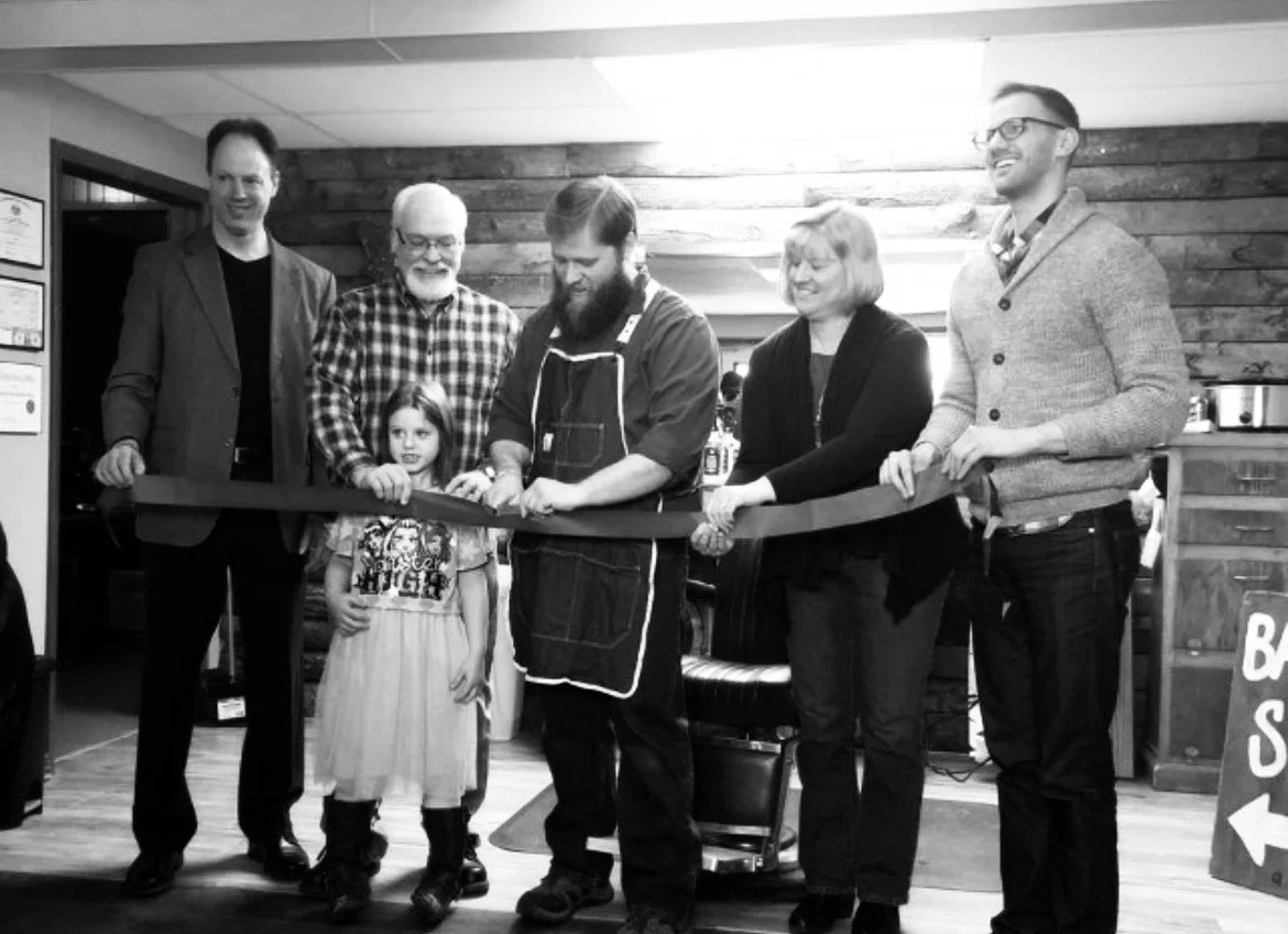 Owner Bubba cutting the ribbon with a straight razor at the Grand Opening Celebration in February 2015. Pictured L-R is PA State Rep. Mark Longietti, Bubba’s father, Ron Beil, Bubba’s niece, Maggie Beil, Bubba, Bubba’s mom, GIna Beil, Greenville Chamber Director Ben Beck.